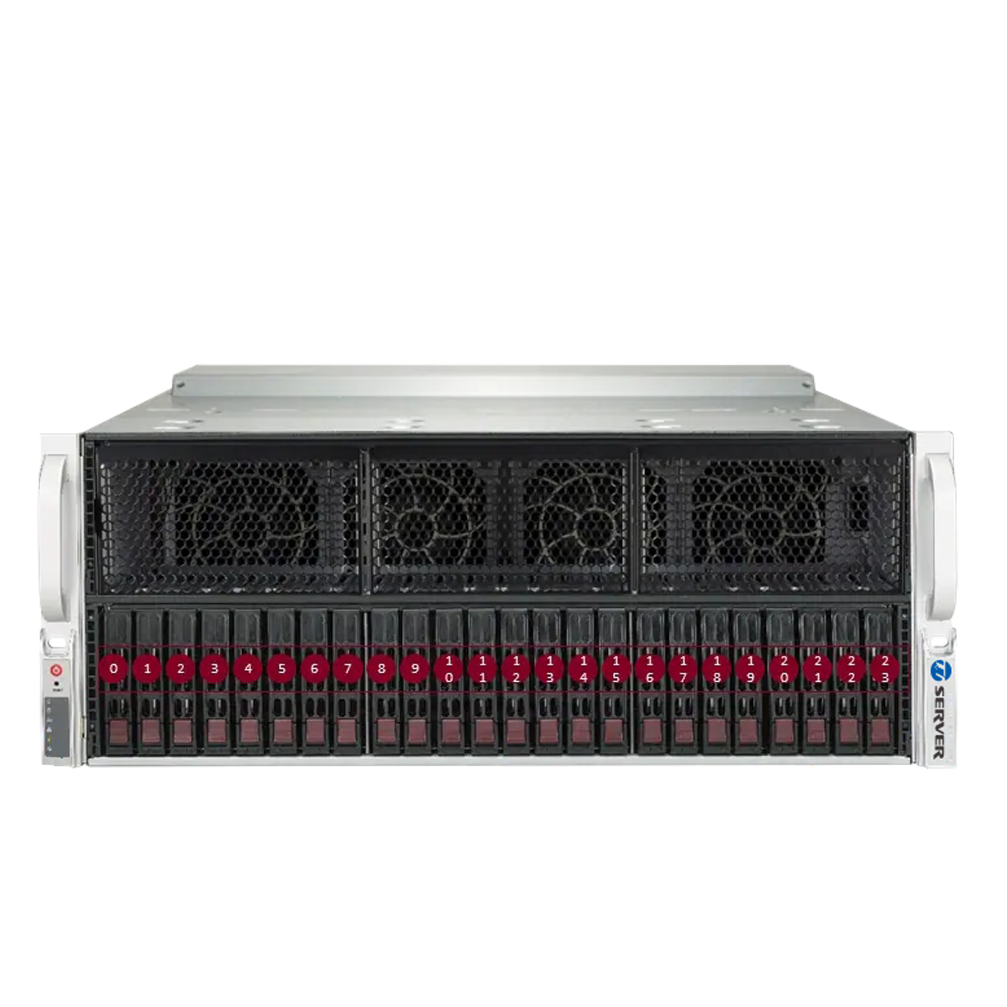 前置支持24個(gè)熱插拔2.5”硬盤位,其中支持4個(gè)NVMe U.2 SSD