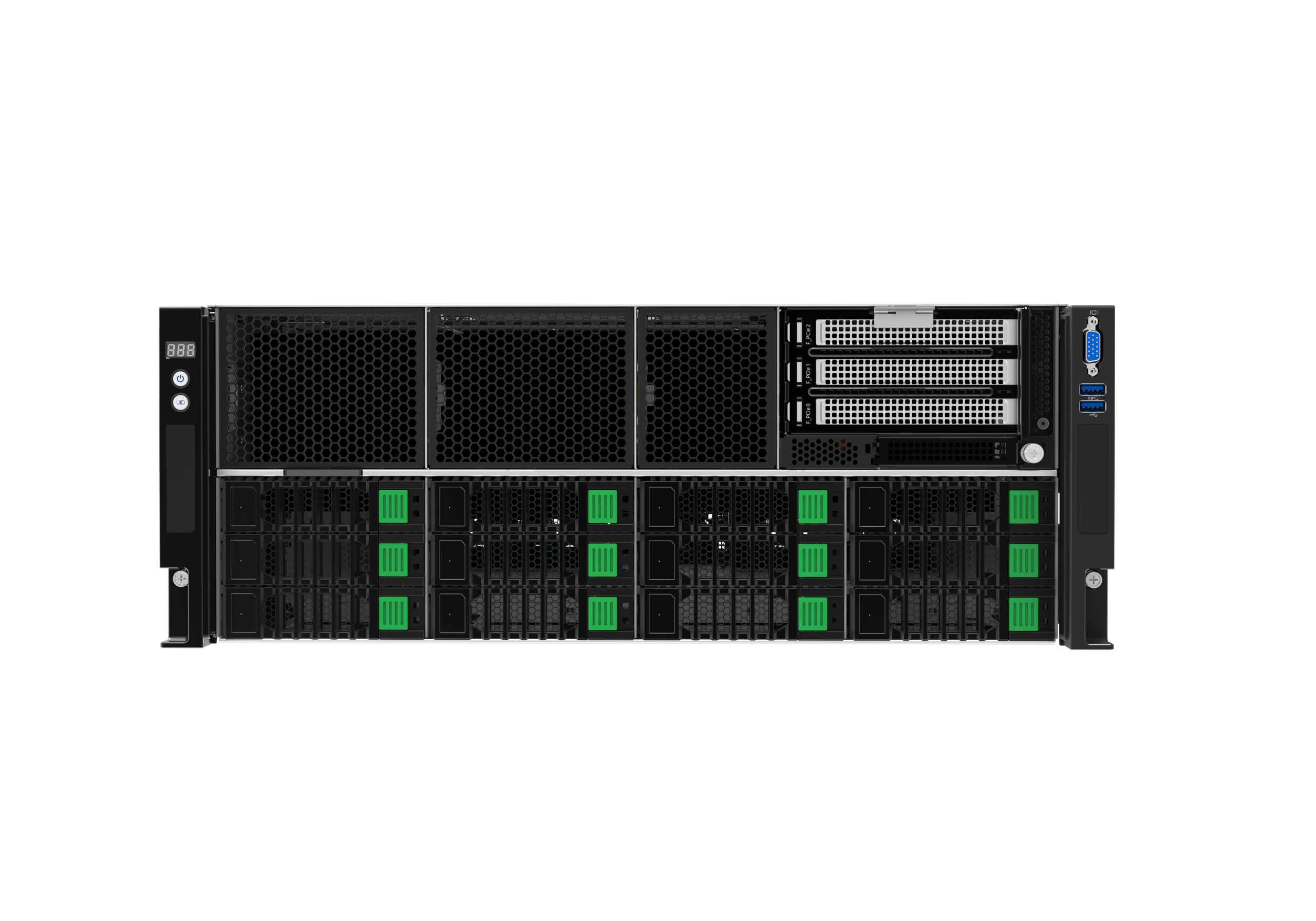 前面板共12個(gè)3.5 英寸組合SATA/SAS抽屜。其中4 個(gè)NVMe/SATA/SAS抽屜。10個(gè)PCIe 5.0X16,以提供更高的帶寬和系統(tǒng)升級(jí)