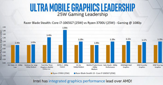 當(dāng)然,最有意思的,應(yīng)該還是和AMD的處理器做比。眾所周知,AMD移動(dòng)版處理器內(nèi)置的Vega核顯是擁有入門獨(dú)顯級(jí)別性能的,比此前英特爾的Gen 9核顯要強(qiáng)出不少,但是隨著Gen 11核顯的到來,情況似乎發(fā)生了逆轉(zhuǎn),根據(jù)官方給出的數(shù)據(jù)顯示,在1080P分辨率下,i7-1065G7(25W)在很多測試的游戲中都超越了采用Vega 10核顯的Ryzen 7 3700U(TDP同樣是25W),在《Dota 2》游戲中甚至有1.84倍的性能領(lǐng)先,最不濟(jì)也能保證持平。