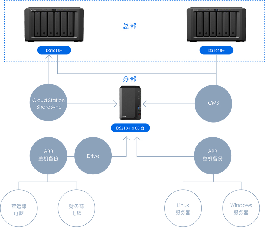 針對(duì)門(mén)店?duì)I運(yùn)部、財(cái)務(wù)部電腦里的重要文件,我們?yōu)殡娔X設(shè)置賬戶并進(jìn)行備份。先用 Drive 將辦公文件備份到分部的 NAS 上,然后再通過(guò) Cloud Station ShareSync ?將文件統(tǒng)一同步并歸檔到總部的 DS1618+ 上。想要管理眾多分部的 80 臺(tái) DS218+ 也很方便,我們可以在總部的 DS1618+ 上統(tǒng)一配置、監(jiān)控所有分部的數(shù)據(jù),并選擇性同步下發(fā)各項(xiàng)公文、通知。