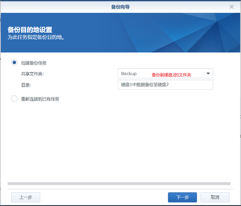 3、下一步,備份目的設(shè)置,為此任務指定備份目的地。選擇要備份的目標文件夾,以及設(shè)置好目錄名。